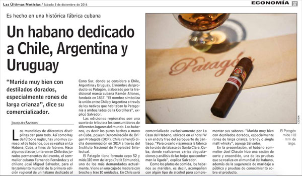 El nombre del producto es Patagón, elaborado por la tradicional marca cubana Ramón Allones, fundada en 1837. "El nombre simboliza la unión entre Chile y Argentina a través de los nativos que habitaban la Patagonia a ambos lados de la Cordillera", explicó Salvador.